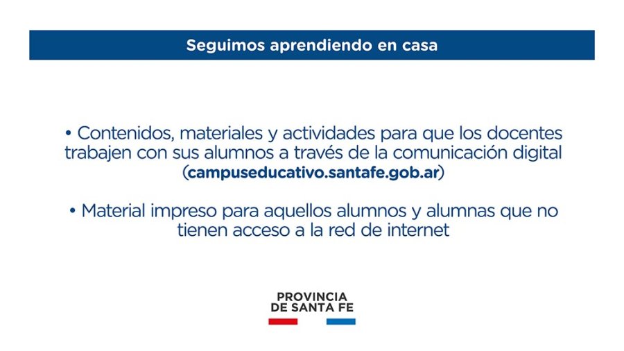 “Para ello -detalló la ministra- contamos con la plataforma educativa, que se llama «Seguimos Aprendiendo en Casa», que ya tiene abierto cuatro blogs para cada uno de los niveles (inicial, primario, secundario y superior), donde los docentes de cada uno de los niveles van a encontrar orientaciones específicas para el trabajo con los estudiantes”.