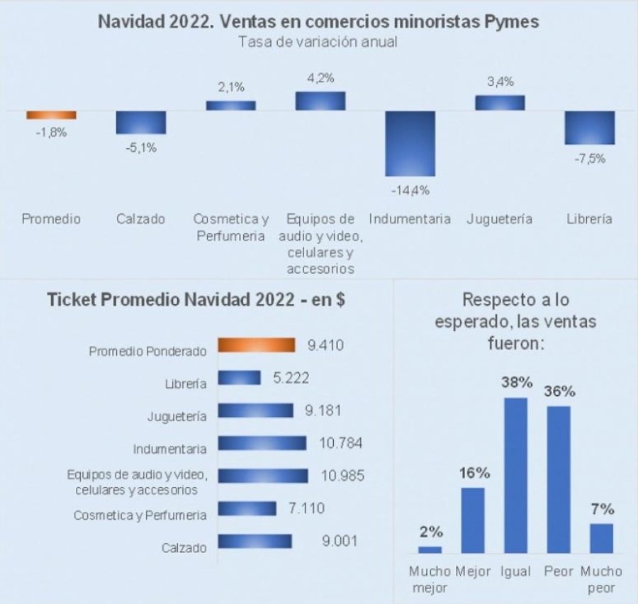 Las ventas navideñas en los comercios minoristas pymes bajaron 1,8% frente al año pasado, a precios constantes, según un revelamiento de la Confederación Argentina de la Mediana Empresa (Came). Esto se debe, en parte, a la menor cantidad de días hábiles que hubo para realizar compras con respecto al 2021.