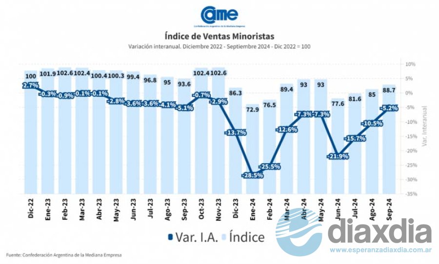 Así surge del Índice de Ventas Minoristas Pymes de la Confederación Argentina de la en Mediana Empresa (CAME), elaborado en base a un relevamiento mensual entre 1.300 comercios minoristas del país, realizado del 1 y 4 de octubre.