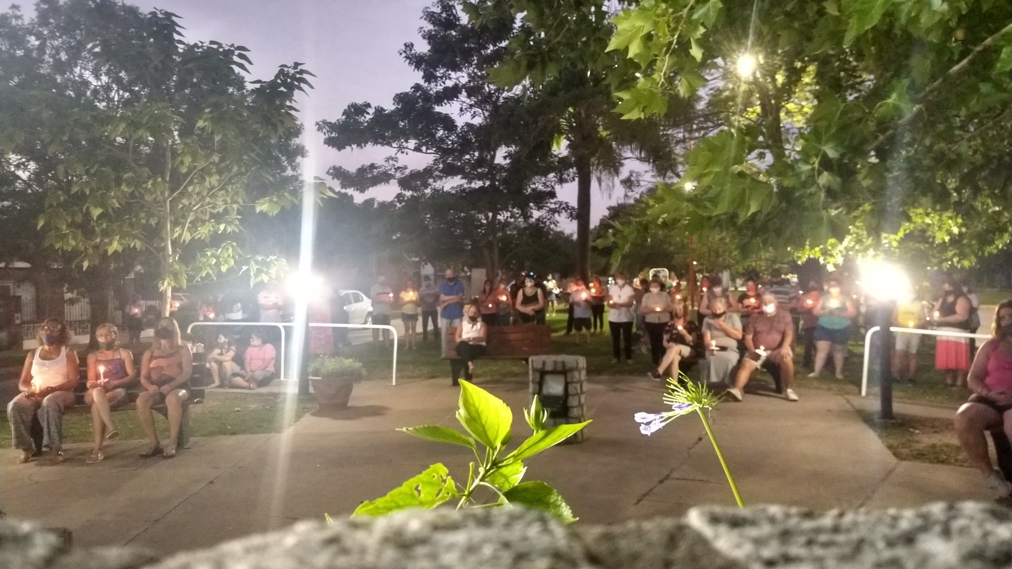 Todo comenzó con una intervención artística en calle Sarmiento, entre 25 de mayo y Avenida Beck y Herzog y luego una importante cantidad de vecinos se concentraron frente a la imagen de la Virgen María en el ingreso a la localidad para rezar y recordar a Noelia Oschstadt.