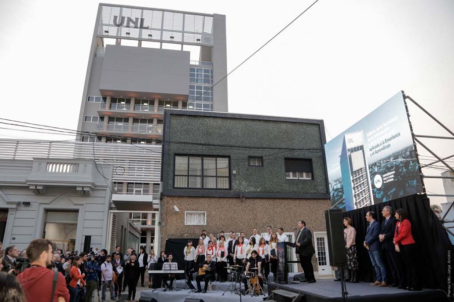Mientras se sucedían las imágenes en las pantallas ubicadas frente a las nuevas instalaciones, el Coro de la UNL acompañó el acto con la interpretación del Himno Nacional. Se proyectó un video institucional sobre el flamante edificio y a continuación un trabajo audiovisual en el que un ensamble musical interpretó el Himno de la UNL, letra de Alfredo Bufano y música Emilio Dublanc. La producción fue realizada por el Instituto Superior de Música (ISM-UNL) y la Secretaría de Extensión Social y Cultural de la Universidad, se desarrolló en el Teatro Municipal “1° de Mayo” y tiene como protagonistas a la Orquesta del ISM, al Coro de la UNL bajo la dirección de Alfonso Paz, al coro del ISM, dirigido por Cristian Walter Gómez; el coro de la Facultad de Ciencias Jurídicas y Sociales, dirigido por Rodrigo Naffa; el coro de Niños de la UNL, dirigido por Soledad Gauna; el coro de Adultos Mayores UNL, dirigido por Mauro de Giovanni; y el coro del Liceo Cultural FAVE, dirigido por José María Rudolf. Cabe señalar que el proyecto fue producido por Matías Bonfiglio y Federico Fontana y contó con la dirección artística de Cristian Walter Gómez. Además, participaron el profesor Matías Dulcich y los estudiantes Lucio Paolucci y Ezequiel Gervasoni de la Cátedra Sonorización y Grabación del ISM y el equipo de Litus TV.