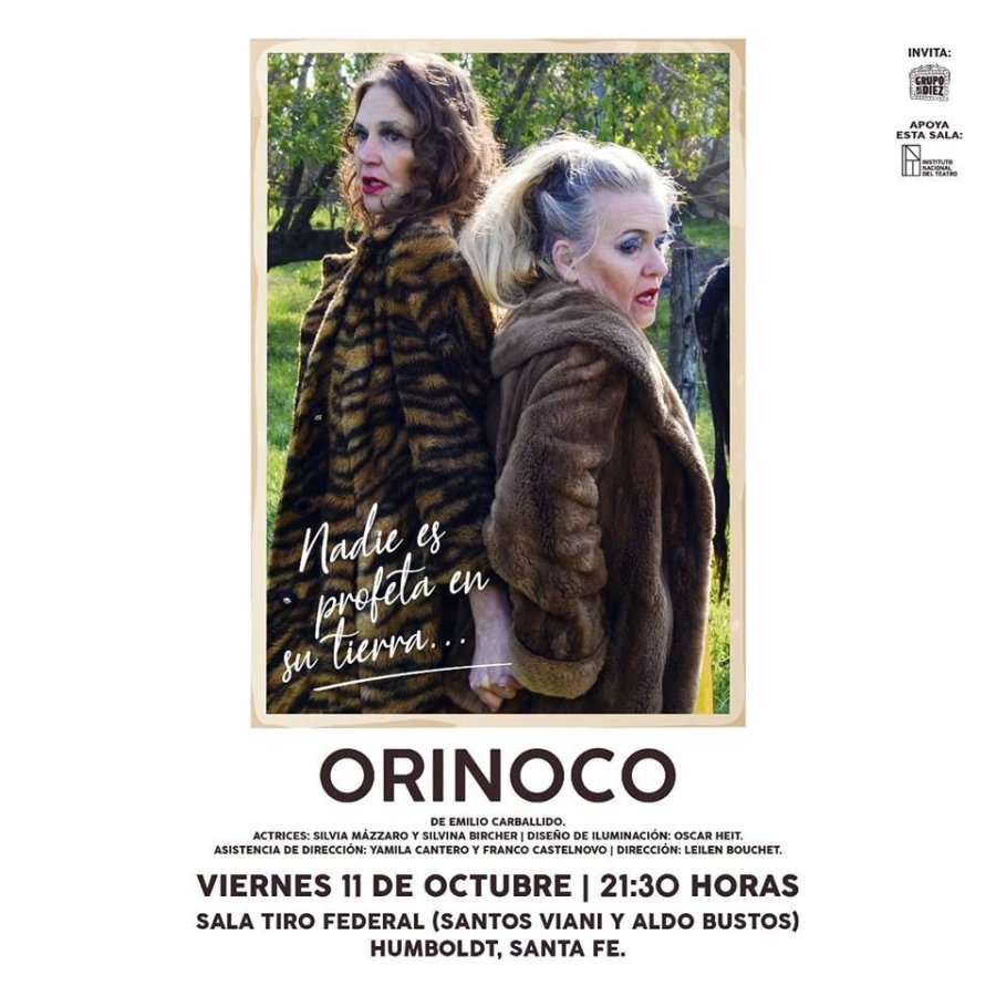 "Orinoco" de Emilio Carballido, con la actuación de Silvina Bircher y Silvia Mazzaro, la asistencia técnica de Franco Castelnovo y Yamila Cantero y la dirección de Leilen Bouchet, hará su segunda función, luego de une estreno con gran aceptación del público, este Viernes 11 de octubre desde las 21:30 en la sala del Tiro Federal, del Grupo de los Diez en Humboldt
