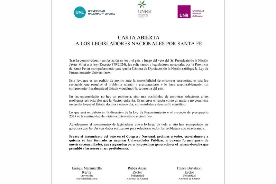 “Tras la conmovedora manifestación en todo el país y luego del veto del Sr. Presidente de la Nación Javier Milei a la Ley (Decreto 879/2024) les solicitamos a legisladores nacionales por la Provincia de Santa Fe su acompañamiento para que la Cámara de Diputados de la Nación ratifique la Ley de Financiamiento Universitario”, comienza la nota.
