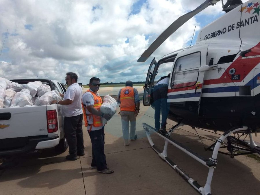 Este martes 1 de enero Protección Civil de la Provincia de Santa Fe comenzó a atender a pobladores aislados con la entrega de bolsones de alimentos y medicamentos preventivos. Las operaciones con el helicóptero se realizaron en el distrito El Nochero donde tenían previsto realizar cinco vuelos para entregar 110 bolsones a diferentes familias.