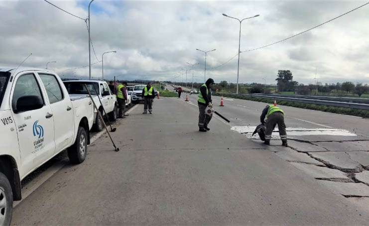 Las labores se concentran en el intercambiador de RN 11 con la Ruta Provincial 70, a la altura de Recreo, donde se ejecuta bacheo preventivo con concreto asfáltico en caliente sobre losas de hormigón dañadas.