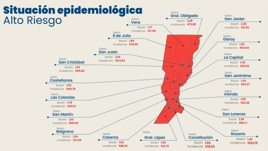La mayor cantidad de casos según el reporte provincial del día se produjeron en las siguientes ciudades: Rosario 1.030, Santa Fe 343, Rafaela 160, Villa Gobernador Gálvez 124, Santo Tomé 81, Reconquista 73 y Esperanza 69.