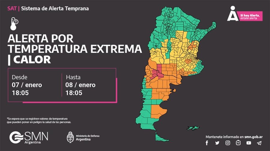 El SMN infirmó que en cuanto a la temperatura este domingo se registró una mínima de 22° y la máxima sería de 37°, bajando a 31° por la noche. Todo el Sur, Centro y parte del Norte de la provincia se encuentran bajo alerta amarillo por altas temperaturas.