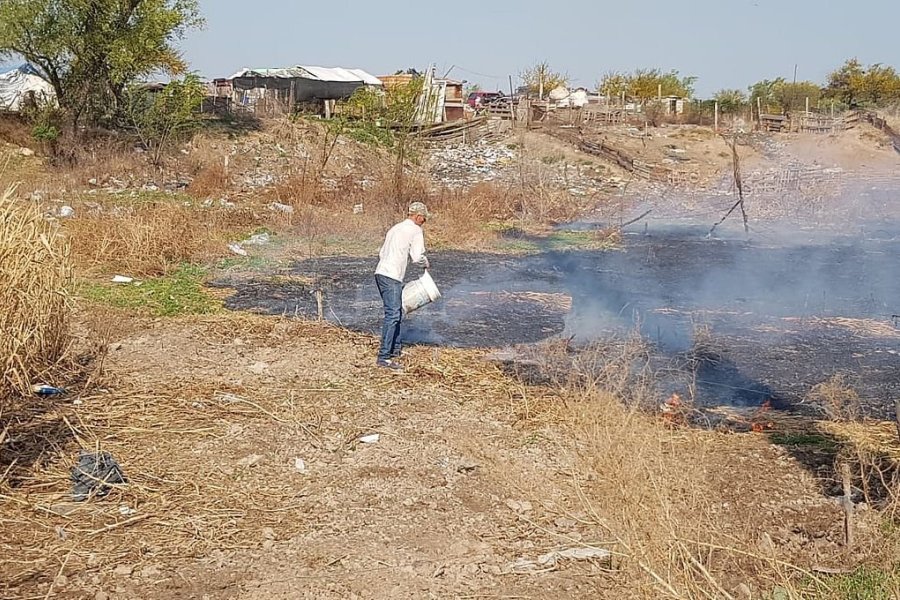 Uno de los vecinos de barrio Nueva Esperanza se acercó con un balde con agua para intentar sofocar algunas de las llamas.
