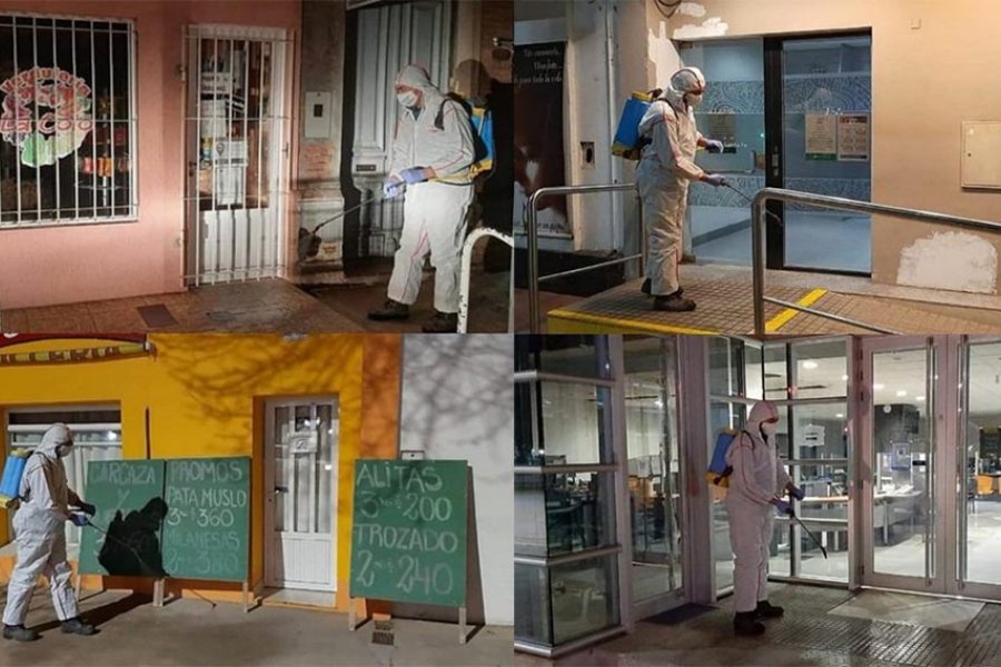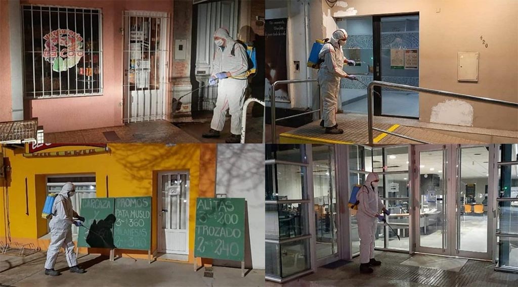 El operativo buscó realizar la desinfección con solución a base de hipoclorito de sodio y agua en las veredas de los locales comerciales donde hay concurrencia de personas durante éste tiempo de distanciamiento social preventivo y obligatorio.