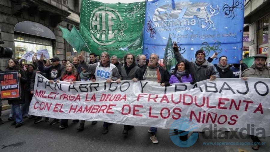 Por la tarde, a pocos metros de la Bolsa de Comercio, en la plaza Sarmiento se concentraron agrupaciones políticas y sociales –Ate, Amsafé Rosario, Movimiento Evita, Libres del Sur, la CCC, entre otras– que se movilizaron en rechazo a las políticas del gobierno de Javier Milei, para luego caminar una cuadra de Corrientes y San Luis hasta Rioja.