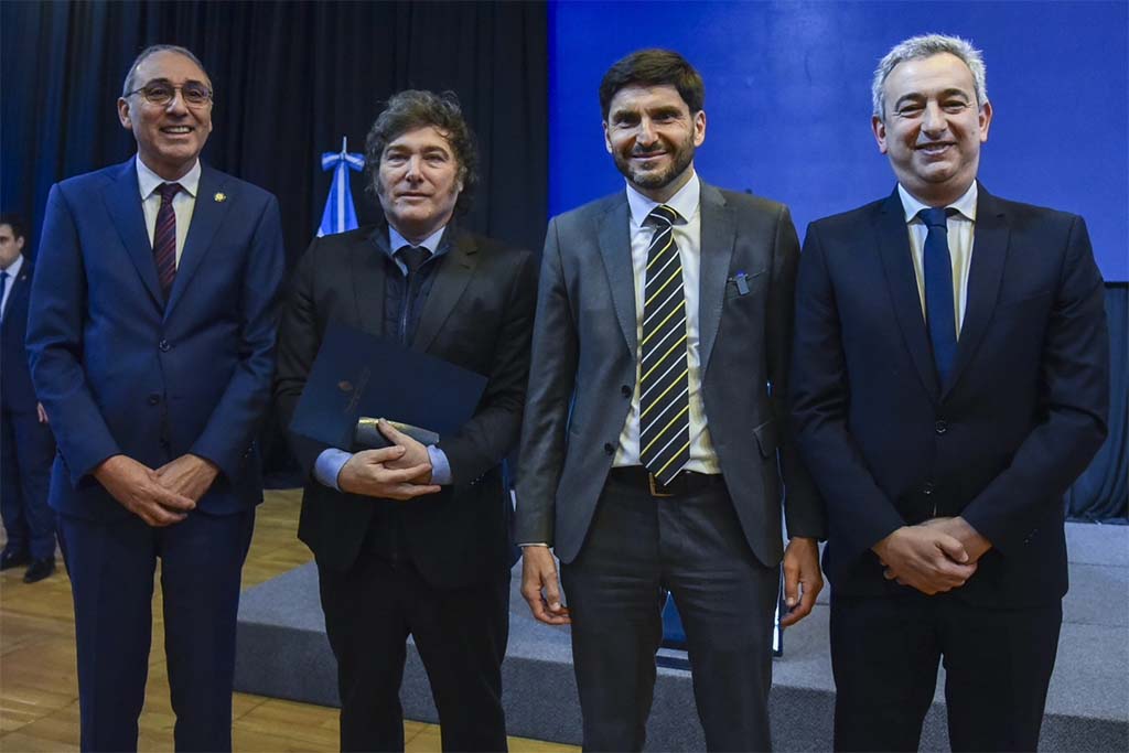 Además de Milei, estaba invitado el ministro de Economía, Luis Caputo; el gobernador de Santa Fe, Maximiliano Pullaro; el intendente de Rosario, Pablo Javkin y cerca de 800 empresarios del sector agroindustrial, financiero e industrial, además del empresariado pyme de la región.