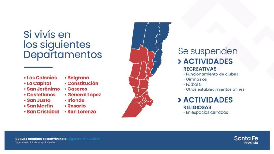 Se restringen actividades de clubes deportivos, gimnasios, canchas de fútbol 5 y celebraciones religiosas en espacios cerrados desde el lunes en el centro y norte de la provincia de Santa Fe pic.twitter.com/a1LRb8ahLJ