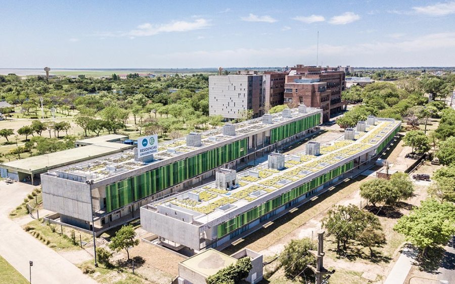 Dos elementos sobresalientes marcan el compromiso de la UNL con una arquitectura sustentable en estos edificios: el sistema de parasoles de última generación mejora la incidencia solar directa dejando pasar las brisas y consiguiendo niveles de temperatura confortables en las épocas estivales. Por otro lado, protege de los vientos del sur los accesos a las residencias.