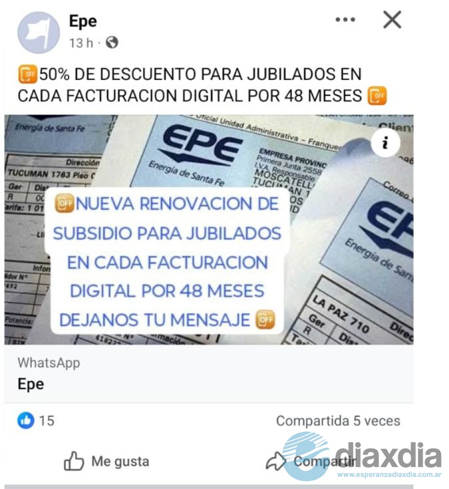 Personal de la Empresa Provincial de la Energía (EPE) advirtió que circulan en redes sociales publicaciones engañosas con beneficios exagerados para los usuarios, fundamentalmente jubilados. Esto se suma a otros intentos de estafas vía Whatsapp o correo electrónico.